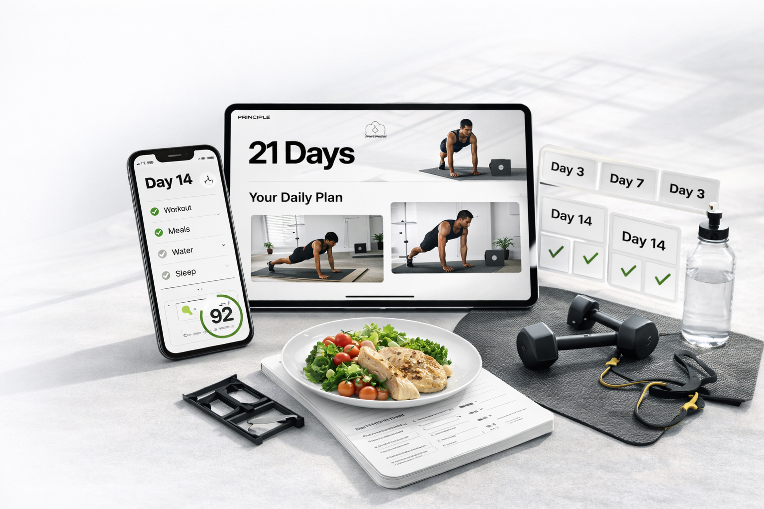 Three non-negotiables. Clear rules. A 21-day structure that removes decision fatigue and forces consistency.